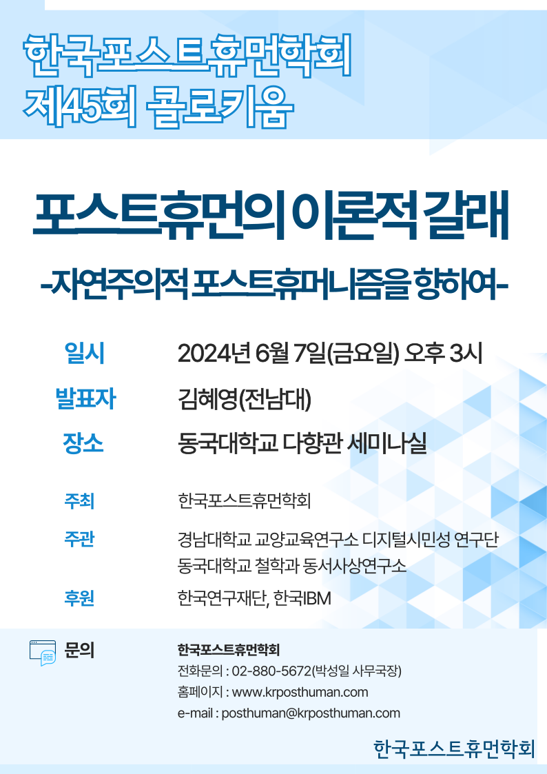 2024년 여름의 기운이 깃드는 시기에 한국포스트휴먼학회 제45회 콜로키움을 개최하고자 합니다.