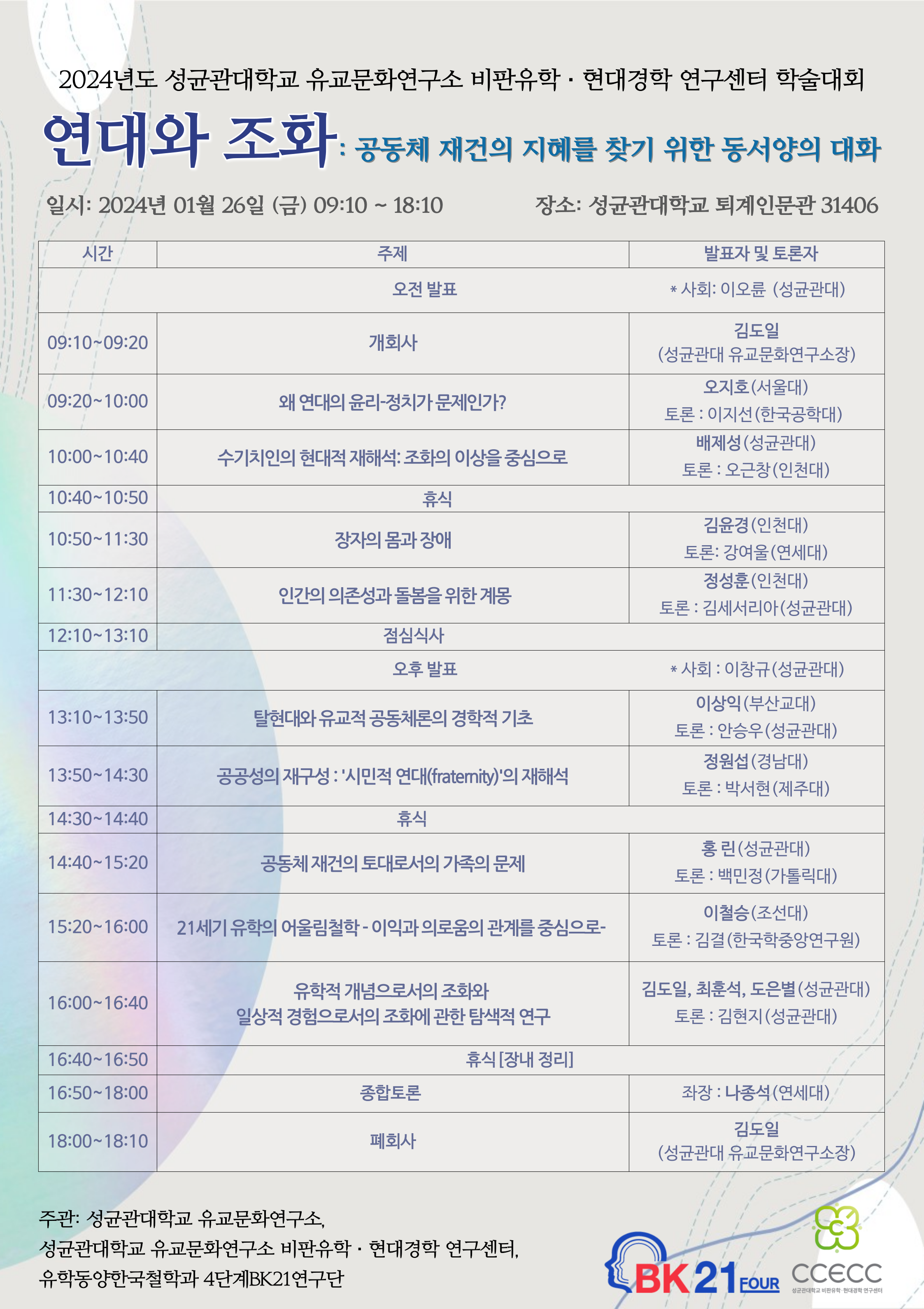 성균관대학교 유교문화연구소 비판유학 · 현대경학 연구센터에서는 오는 1 월 26 일 ( 금 ) 성균관대학교 퇴계인문관 31406 호에서 < 연대와 조화 – 공동체 재건의 지혜를 찾기 위한 동서양의 대화 > 학술대회를 개최합니다 .