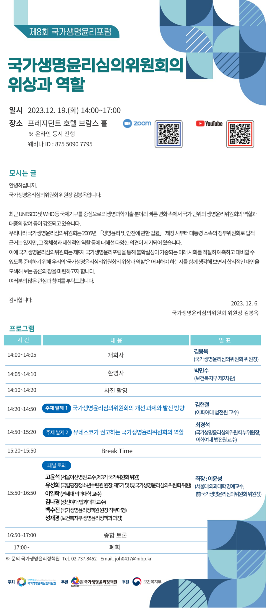 [국가생명윤리정책원] 국가생명윤리심의위원회 주최 「제8회 국가생명윤리포럼」개최 안내