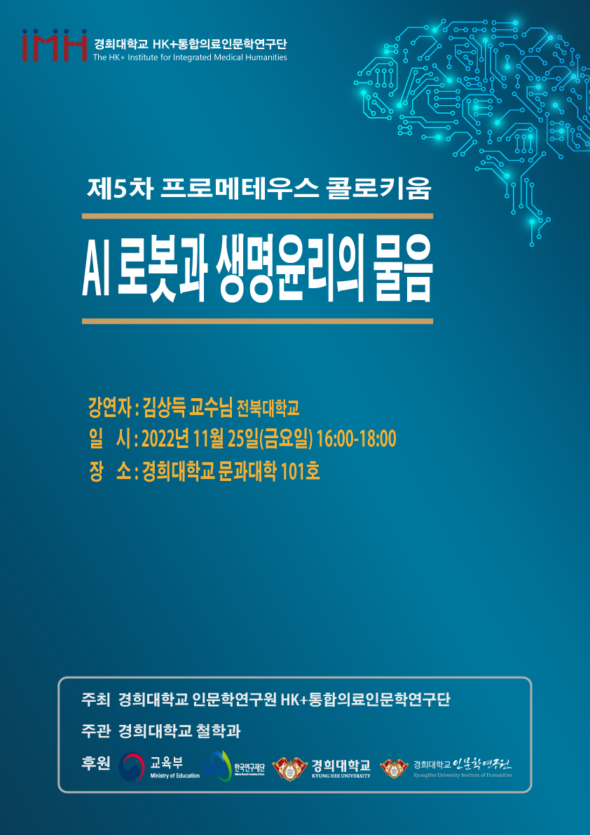 경희대학교 인문학연구원 HK+통합의료인문학연구단에서는 경희대 철학과 주관으로 2022-2분기 '(4차 산업혁명시대를 위한) 프로메테우스 콜로키움' 학술행사를 진행하고 있습니다. 2022-1분기에는 '첨단기술의 의료적 활용과 윤리적 문제'(1차), '실천철학으로서의 기술철학'(2차), “오래된 미래: 서양고중세의료”(3차)를 주제로, 2022-2분기에는 '포스트휴먼 담론의 지형'(4차)을 주제로 콜로키움을 진행하였습니다. 이번 5차 행사에서는 'AI로봇과 생명윤리의 물음'을 주제로 학술대회가 진행됩니다. 관심 있는 분들의 많은 참여를 바랍니다.