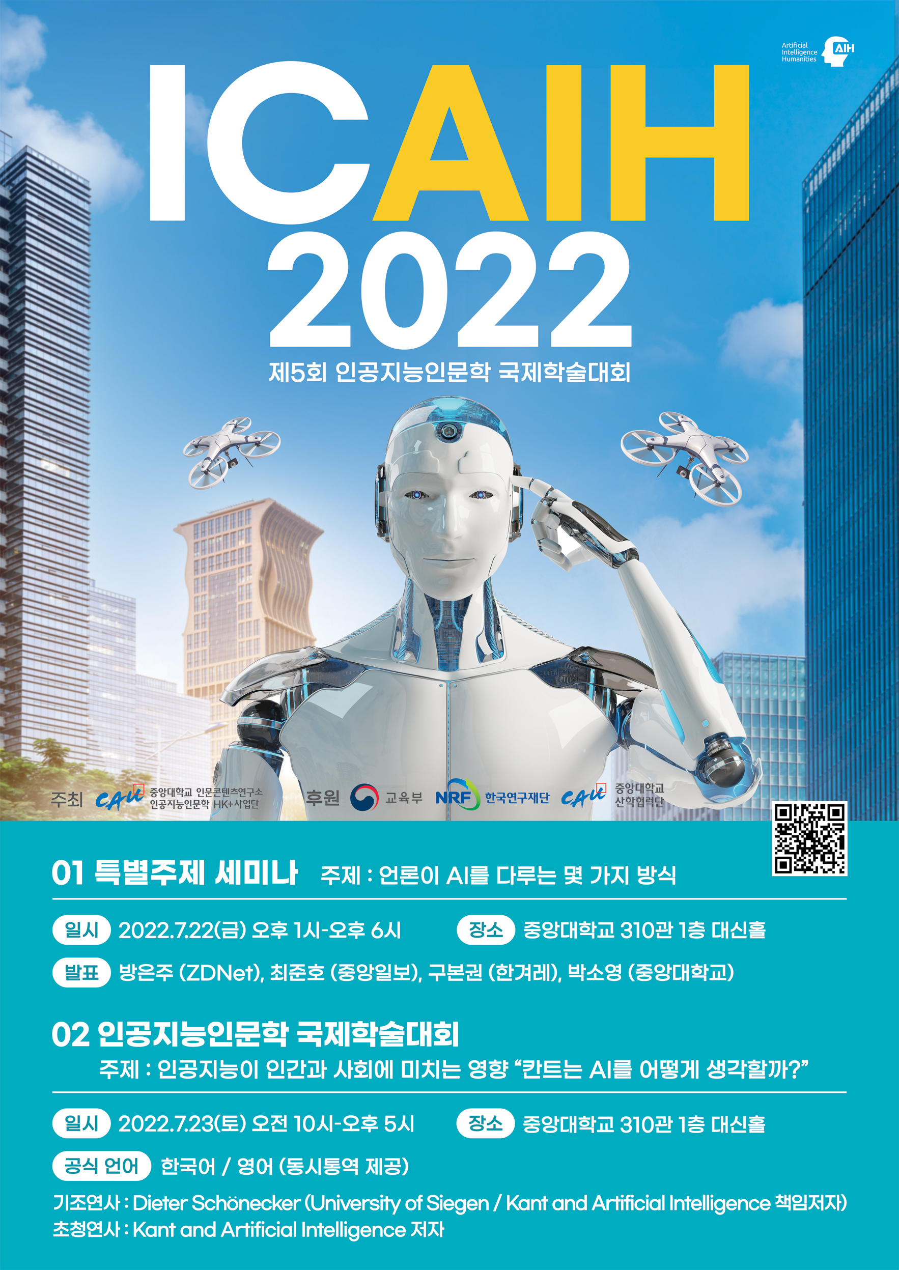 인공지능 인문학 구축 및 정착을 위한 학제 간 연구교류와 사업단 연구 성과를 공유하기 위해 제5회 인공지능 인문학 국제학술대회 (ICAIH 2022)를 2022년 7월 22일, 23일 양일간 진행합니다.