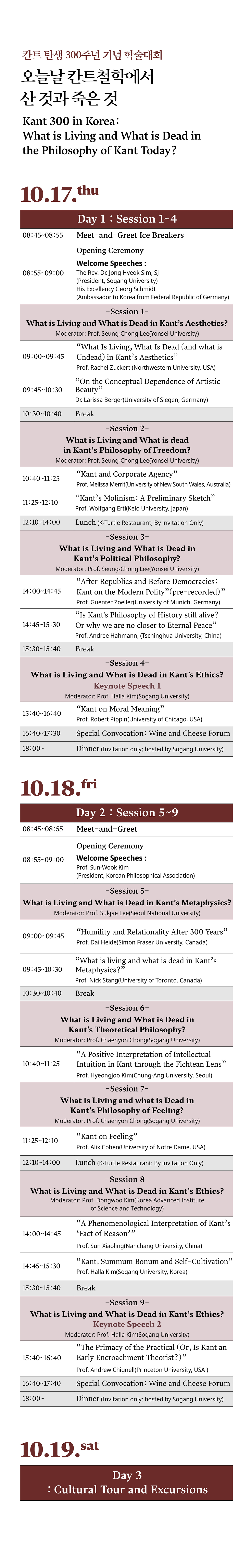 선생님, 안녕하세요? 추석 연휴 잘 지내셨는지요? 한국칸트학회는 칸트 탄생 300주년을 맞이하여, 북미칸트학회와 독일디지털칸트연구센터, 서강대학교 철학과,전남대학교 인문학연구원과의 협업 하에 오는 10월 국제 학술대회 <칸트 탄생 300주년: 오늘날 칸트철학에서 산 것과 죽은 것 Kant 300 in Korea: What is Living and What is Dead in the Philosophy of Kant Today?>를 개최합니다. 한중일, 북미, 독일, 호주 등지에서 현재 칸트연구의 최전선에서 활약 중인 저명한 연구자들의 발표를 들을 수 있는 소중한 기회가 될 것입니다. 학술 프로그램은 10월 17일과 10월 18일 양일간 진행됩니다. 학술대회 타임테이블은 첨부파일을 확인해주시기 바랍니다. 회원 선생님들의 많은 참석과 성원을 부탁드립니다. 감사합니다.