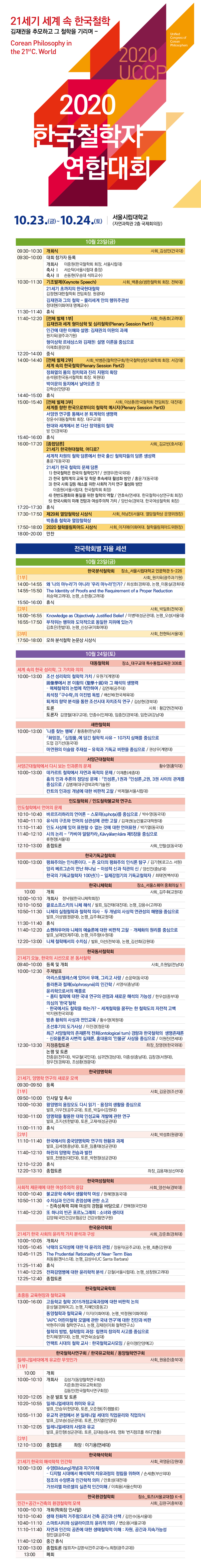 코로나 19라는 전대미문의 사태에도 불구하고 한국철학자 연합대회의 성공을 위해 적극 참여해 주신, 모든 발표자와 토론자분들 그리고 공동주최 학회의 모든 임원 및 관계자 분들의 노고에 다시 한번 머리 숙여 감사드리며, 10월 23-24일 양일 간 서울시립대학교에서 (온/오프라인 병행으로) 개최되는 연합 학술대회에 적극 참여해 주시길 당부드립니다. 감사합니다.
